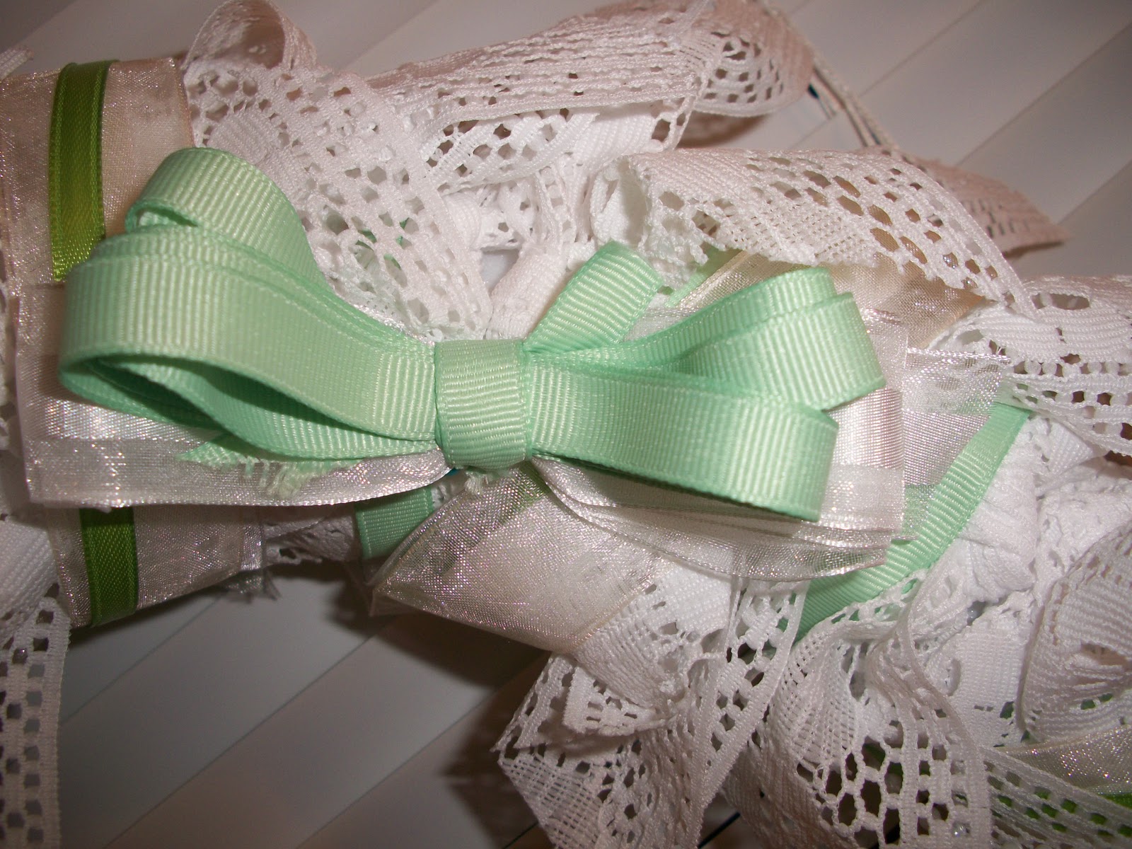 I finished it with some pretty green ribbons and strings of pearls and a little bow.
